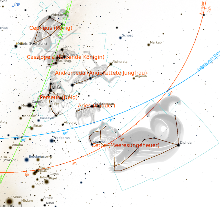 Wie gewöhnlich stehen drei Konstellationen zu Widder in Beziehung. Erstens Cassiopeia, die Königin auf dem Thron, immer das Symbol der Materie. Es ist sehr interessant zu sehen, wie wir im Kreis des Zodiak auf drei Frauen stoßen. In Verbindung mit Widder, dem Zeichen des Beginns, ist Cassiopeia die beherrschende Frau. Materie herrscht. Die Form betört. In der Mitte, im Zeichen Jungfrau, finden wir Mutter und Kind und, wie wir später sehen, ist die Mutter-Materie die Ernährerin des Kindes (des Sohnes, Christus) die Jungfrau Maria bringt Jesus zur Welt. In den Fischen, am Ende der großen Runde, finden wir Andromeda, die gefesselte Frau. Erst die Frau auf dem Thron und beherrschend, dann die Frau das Kind betreuend, den Christus, und dann die Frau, welche die nun beherrschte und kontrollierte Materie repräsentiert. Cassiopeia finden wir auf dem arktischen Zirkel dicht neben Cepheus sitzend, dem König oder Gesetzgeber, den wir später als eine der drei Konstellationen in den Fischen antreffen. Am Anfang Gesetz und am Ende Gesetz; denn Cepheus hat eine enge Beziehung zum ersten und zum letzten Zeichen des Zodiak. Es ist interessant zu beachten, dass Mohammed, der Gründer der militantesten Religion, in diesem Zeichen geboren wurde und die Legende sagt, dass auch Moses in ihm geboren war; Moses der Gesetzgeber und Mohammed der Krieger!