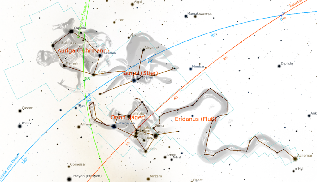 Die drei mit dem Zeichen verknüpften Konstellationen sind Orion, Eridanus und Auriga und die Art der Aufgabe im Stier wird uns von den drei Bildern, die sie uns in den Himmeln darbieten, wunderbar vorerzählt. Der alte Name des Orion war «die drei Könige» wegen der drei schönen Sterne, die wir in seinem Gürtel sehen. Die drei Könige repräsentieren die drei göttlichen Aspekte des Willens, der Liebe und der Intelligenz und daher steht Orion symbolisch für den Geist. Der Name Orion heißt wörtlich «das Hervorbrechen des Lichts».