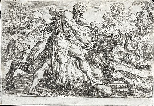 Minos, der König von Kreta, besaß einen heiligen Stier, den er auf der Insel Kreta hielt. Eurystheus sandte nach Herkules und sagte ihm, es sei notwendig den Stier zu fangen und ihn von der Insel aufs Festland zu bringen. Es wurden keinerlei Instruktionen gegeben, wie das zu bewerkstelligen sei und Herkules wusste nur, dass der Stier heilig war, dass er aus dem Meer geboren und dazu bestimmt sei, dem Minos als Opfer dargebracht zu werden. Herkules begab sich daher nach Kreta und durchsuchte die ganze Insel. Er verfolgte den Stier von Ort zu Ort, bis er