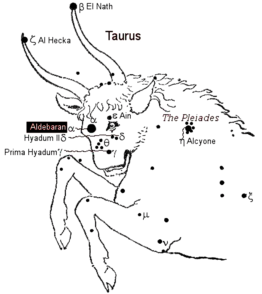 Das «Auge des Bullen» im Stier, der herrliche Fixstern Aldebaran, ist einer der Gründe, warum diese Konstellation als Erleuchtung übermittelnd angesehen wird. In alten Tagen wurde er der führende Stern der Himmel genannt. Der Stier wurde immer mit Licht in Verbindung gebracht und deshalb mit Christus, der von sich selbst sagte, er sei das Licht der Welt. Licht, Erleuchtung und der Ton als ein Ausdruck schöpferischer Kraft – dies sind die drei grundlegenden Ideen, die mit dieser Konstellation verbunden sind. Der «Interpret der göttlichen Stimme», wie Stier im alten Ägypten genannt wurde, kann in der christlichen Terminologie frei wiedergegeben werden als «das fleischgewordene Wort». Es ist ein interessanter Hinweis auf die Macht der zodiakalen Einflüsse, wenn wir uns vergegenwärtigen, dass Worte wie «Bullaugenlaterne», was auf das Bullauge im Sternbild Stier hinweist und die päpstlichen «Bullen», die päpstlichen Kundgebungen, die als Interpretation der Stimme Gottes betrachtet wurden, allgemein gebräuchlich sind.