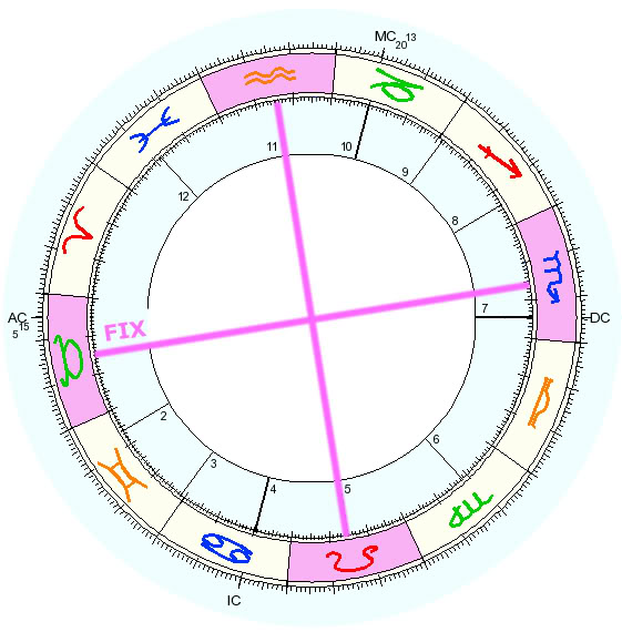 Die dominante Aspektfigur ist das Strömer-Viereck zwischen Jupiter/Uranus, Sonne/Mond, Saturn und Neptun. In einer solchen Figur sind immense Willenskräfte aber auch Konfliktpotentiale enthalten (die sich kreuzenden roten Aspekte im Inneren der Figur), die im Leben sinnenwach, gekonnt und talentiert gehandhabt werden können (grüne und blaue Aspekt außen). Die Welt besteht in diesem Viereck aus einem harmonischen Teil, in dem alles perfekt oder in Ordnung sein muss (blaue Aspekte), und einem intellektuellen Teil (grüne Aspekte), in dem ständig neue Fragen auftauchen, mit denen man sich denkerisch auseinandersetzt. Ist man sich der inneren Willenskräfte bewusst, kann man sehr kreativ agieren und auch schwierige Ziele erreichen. Da es immer noch um die Spannung zwischen den Werten der alten und der neuer Welt geht auf der Ebene der Existenz (Saturn Opposition Uranus auf der Existenzachse Jungfrau/Fische), zwischen Beharrung und Expansion, könnte der Stier-Neumond neue Impulse wecken, wie mit diesem Konflikt harmonisch (blaue Aspekte) und intelligent (grüne Aspekte) umgegangen werden könnte.