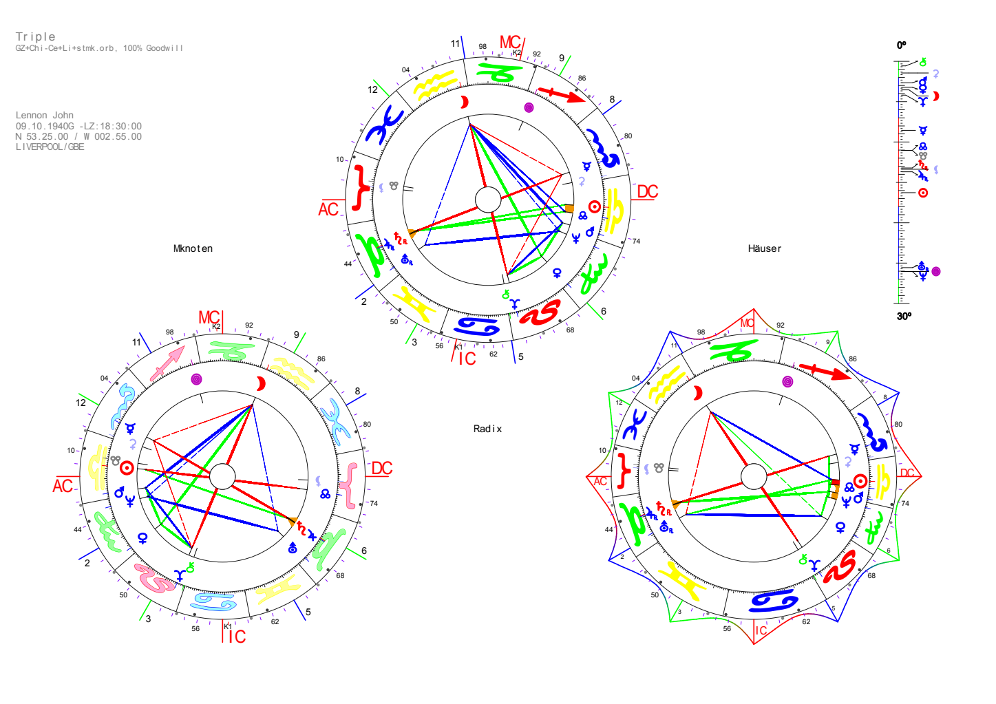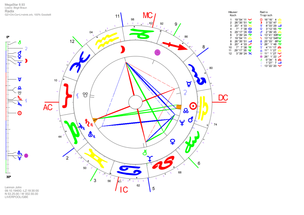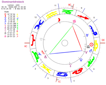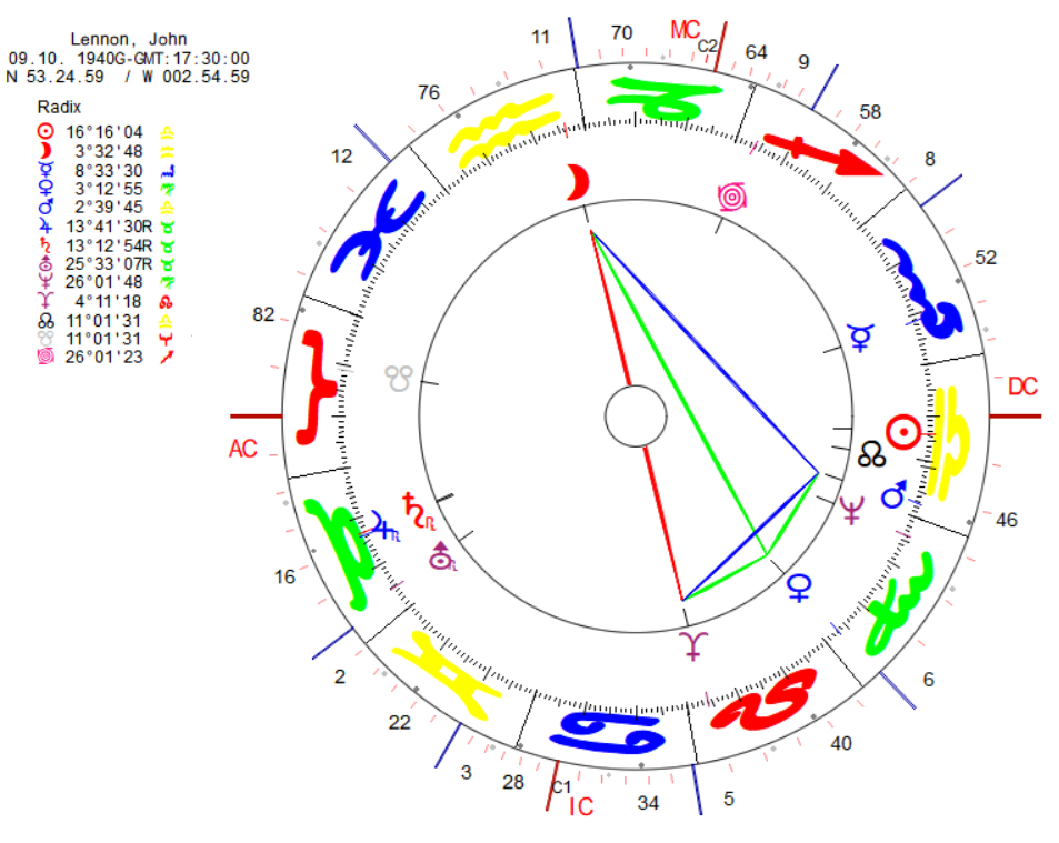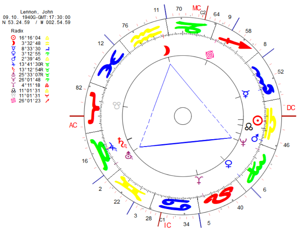 Eine ähnliche, aber sehr viel subjektivere Wirkung entfaltet das aufgrund der einseitigen weil teilweise gestrichelten Trigone des Mondes zum Trigon zwischen Uranus und Neptun unvollständigen und damit latenten Großen Trigons, das hier einerseits ein stark ausgeprägtes Talent zeigt, das jedoch schnell zu Stolz, übermäßiger Selbstgewissheit und „Eigendünkel“ führen kann, der auf Kompensationen hinausläuft wie zum Beispiel der publikumswirksamen Behauptung, man sei berühmter (und damit „einflussreicher“) als Jesus Christus.