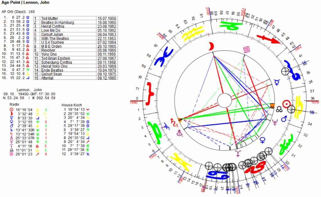Den frühen Erfolgen der Beatles-Jahre (Alterspunkt in Krebs und Löwe) folgten im Zeichen Jungfrau und später in Waage Phasen der privaten Eskalation (temporäre Trennung von Joko Ono, Heroinsucht usw.) und des allgemeinen Rückzugs bis zur Geburt seines zweiten Sohnes Sean (Radix-AP Kojunktion aufsteigender Mondknoten). Kreative Durchbrüche traten oft nach inneren Krisen auf. Wiederholte Macht‑ und Loyalitätskonflikte mit Partnern und Gruppen entstanden aus der drängenden Mond‑Pluto‑Dynamik. Die Kombination dieser Dynamik und eines leistungsfähigen Merkur‑Dreiecks beschreiben einen Künstler, dessen tief traumatischen und machtvollen Gefühlslandschaften privat gehalten, aber künstlerisch und kommunikativ überaus wirksam kanalisiert wurden. Das ergibt ein Profil intensiver innerer Arbeit, pointierter öffentlicher Provokation und hoher formaler Meisterschaft in Sprache und Song.