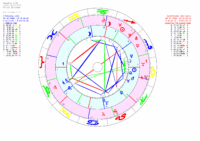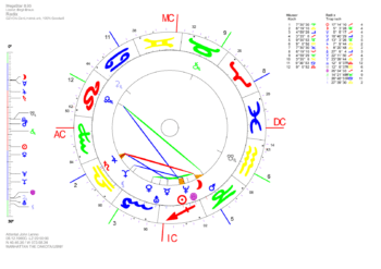 Merkur im Skorpion am Talpunkt des 7. Hauses in Opposition zur Jupiter/Saturn-Konjunktion in Stier am Talpunkt 1. Haus zeigen einen Kommunikations- und Denkstil, der tief, eindringlich und subjektiv orientiert arbeitet. Die Opposition zur Jupiter/Saturn-Konjunktion in Stier verbindet dabei expansive, aber auch strukturierende Lebensthemen mit der Ich-Darstellung. Die öffentliche Meinung und die Arbeit als Künstler beeinflussen die Neigung zu intensiver Kommunikation und Streitgesprächen.