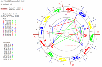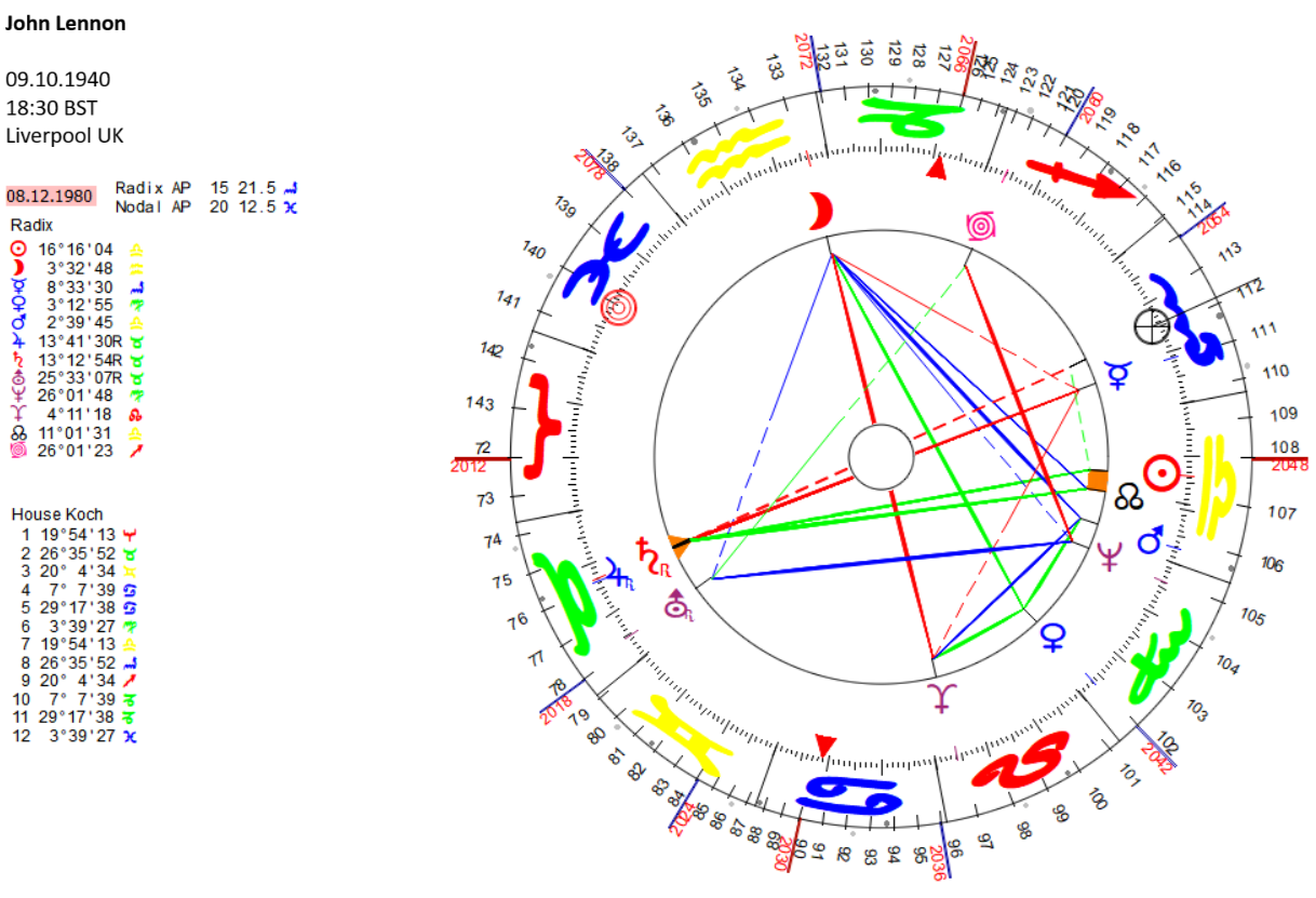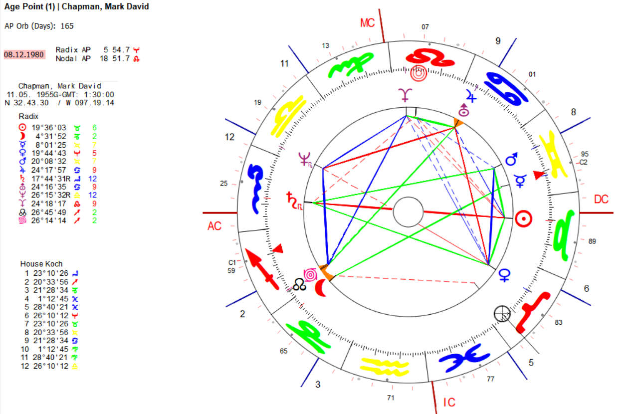 Der Alterspunkt, der am Abend des 8. Dezember 1980 zum Todeszeitpunkt die Opposition zwischen Merkur und Jupiter/Saturn berührte, markierte eine Phase, in der Lebensthemen rund um das Thema Kommunikation, öffentliche Stellung und Einflussnahme expansiven, oft riskanten oder übersteigerten Mächten im Außen gegenüber standen. Merkur symbolisiert Ausdruck, Vermittlung und unmittelbare Begegnungen. Jupiter erweitert und vergrößert die Wirkung, Chancen und zugleich Exponierung. Die Opposition des Alterspunktes zu Saturn am Talpunkt des 1. Hauses betont eine Phase grundlegender Einschränkung, Endgültigkeit und Ich‑Krise. Saturn am Talpunkt des 1. Hauses symbolisiert in der Radix ein Erleben von Machtverlust, Niederlage oder unabwendbarer Begrenzung im Kernbereich des Selbst. Die Opposition aktiviert dieses Thema akut.