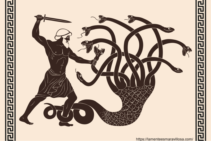Herkules muss die Hydra als das ganze Ungeheuer erkennen und nicht als eine Bestie mit neun verschiedenen Köpfen. Solange er versuchte die Köpfe, einen nach dem anderen abzutrennen, hatte er keinen Erfolg. Erst als er mit ihr als einer Einheit verfuhr, errang er über sie den Sieg.