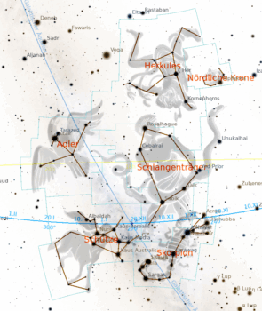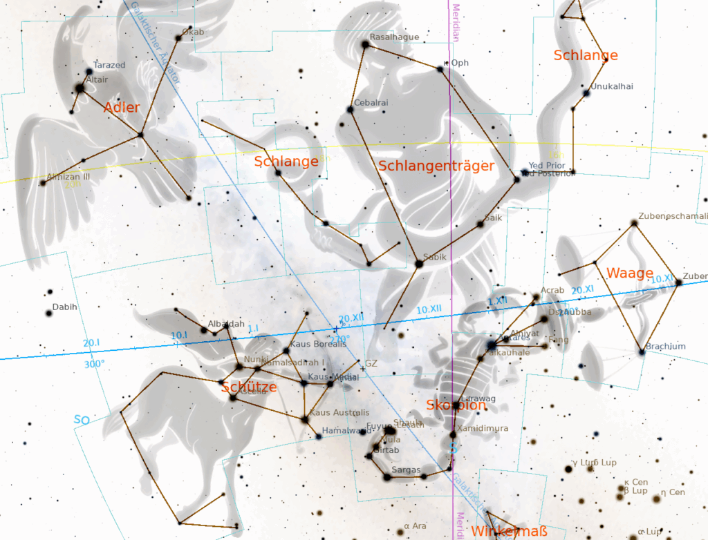 Es sind drei Konstellationen mit diesem Zeichen verknüpft, die ungeheuer interessant sind. Zuerst haben wir Serpens, die Schlange der Illusion, der wir in der Genesis begegnen als sie Eva verführte. Die zweite ist Ophiuchus, der mit der Schlange ringende Mann. Der Alte Zodiak bildet die Schlange in Händen dieses Mannes ab. Er packt sie mit beiden Händen und tritt auf ihr Herz, das der rote Stern des Begehrens ist. Dabei blickt er auf die Konstellation, die wir in Waage sahen, die Krone. So haben wir die Persönlichkeit, die durch den mit der Schlange der Illusion ringenden Ophiuchus symbolisiert wird, vor sich die Krone nach der er strebt.