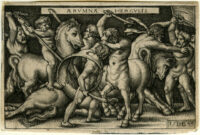 Über die Alpen trieb er das Vieh und nach Italien. Wo immer Unrecht konnte triumphieren, versetzte er den Mächten des Bösen vernichtend todbringenden Schlag und stellte wieder her das Gleichgewicht zugunsten der Gerechtigkeit. Als Eryx, der unbesiegte Ringer ihn angriff, warf Herkules so kraftvoll ihn zu Boden, dass dieser liegen blieb. Und als der Riese Alcyoneus einen Felsen, der eine Tonne wog, nach unsrem Helden schleuderte, fing dieser ihn mit seiner Keule auf, warf ihn auf den zurück, der ihn geworfen hatte, und tötete auch ihn.