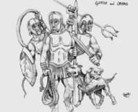 Bald schon kam er zu einem Weideland, wo die rotbraune Herde graste. Sie wurde von dem Hirten Eurytion und dem zweiköpfigen Hund Orthrus gut bewacht. Als Herkules sich näherte, schoss der Hund vorwärts, wie ein Pfeil fliegt in sein Ziel. Die Bestie stürzte sich, bösartig knurrend und mit gefletschtem, wild zuschnappendem Gebiss auf den Besucher. Mit einem wohlgezielten Schlag erlegte Herkules das Ungeheuer.