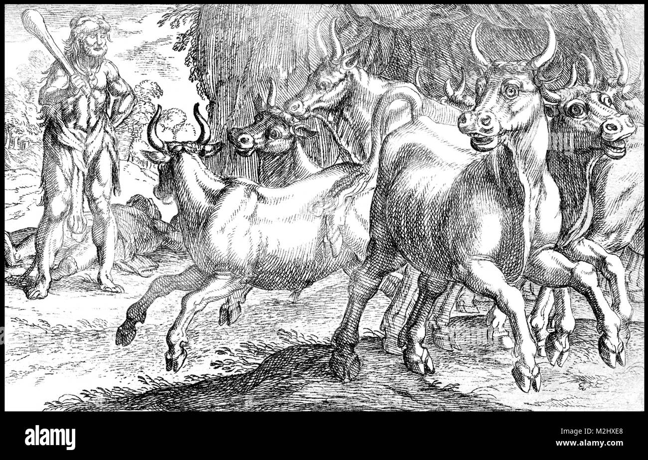 Dann flehte Eurytion, voll Furcht vor diesem tapf’ren Krieger, der vor ihm stand, er möge ihm das Leben lassen. Herkules willfahrte seiner Bitte. Die blutigrote Herde vor sich treibend, wendete Herkules sein Angesicht der Heiligen Stadt nun zu.